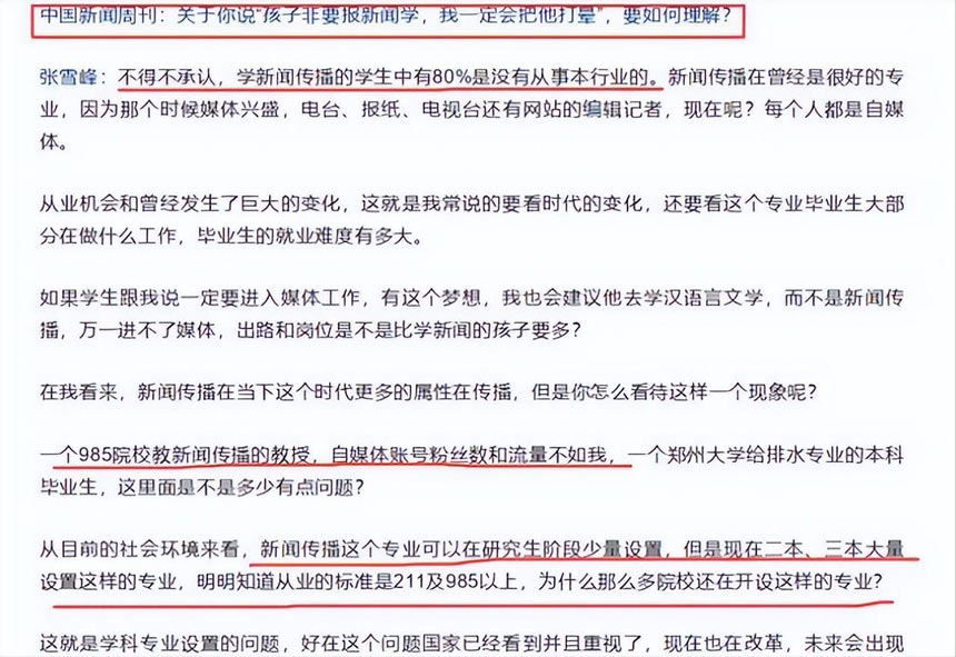 這樣有些激烈的言論很快就在網(wǎng)絡上發(fā)酵起來,當時正值高考季,以張雪峰的影響力在網(wǎng)絡上公開做出這樣的發(fā)言,無疑會對各個院校的新聞專業(yè)招生工作產生巨大的阻力。