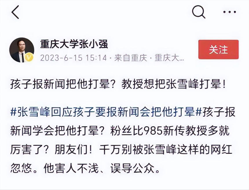 后來重慶大學的教授張小強直接在網(wǎng)絡上發(fā)布文章怒斥張雪峰誤導公眾,害人不淺。