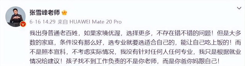 而后張雪峰再次回應道,他的表達是為了普通老百姓著想,希望同學們能選擇最適合自己的專業(yè)。