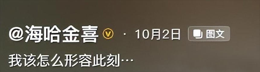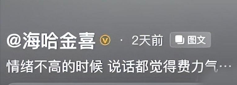 在社交媒體上,海哈金喜的一些表現(xiàn)也有些異常,雖然每次的發(fā)文只有寥寥數(shù)字,但卻字里行間透露著失落和傷感。