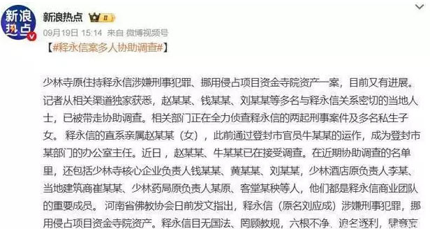 根據(jù)某個(gè)地方的新聞通報(bào),關(guān)于釋永信的調(diào)查有了新的進(jìn)展,據(jù)悉這一次有多人協(xié)助調(diào)查,而在這些人當(dāng)中更是有著疑似釋永信的私生女被曝光。