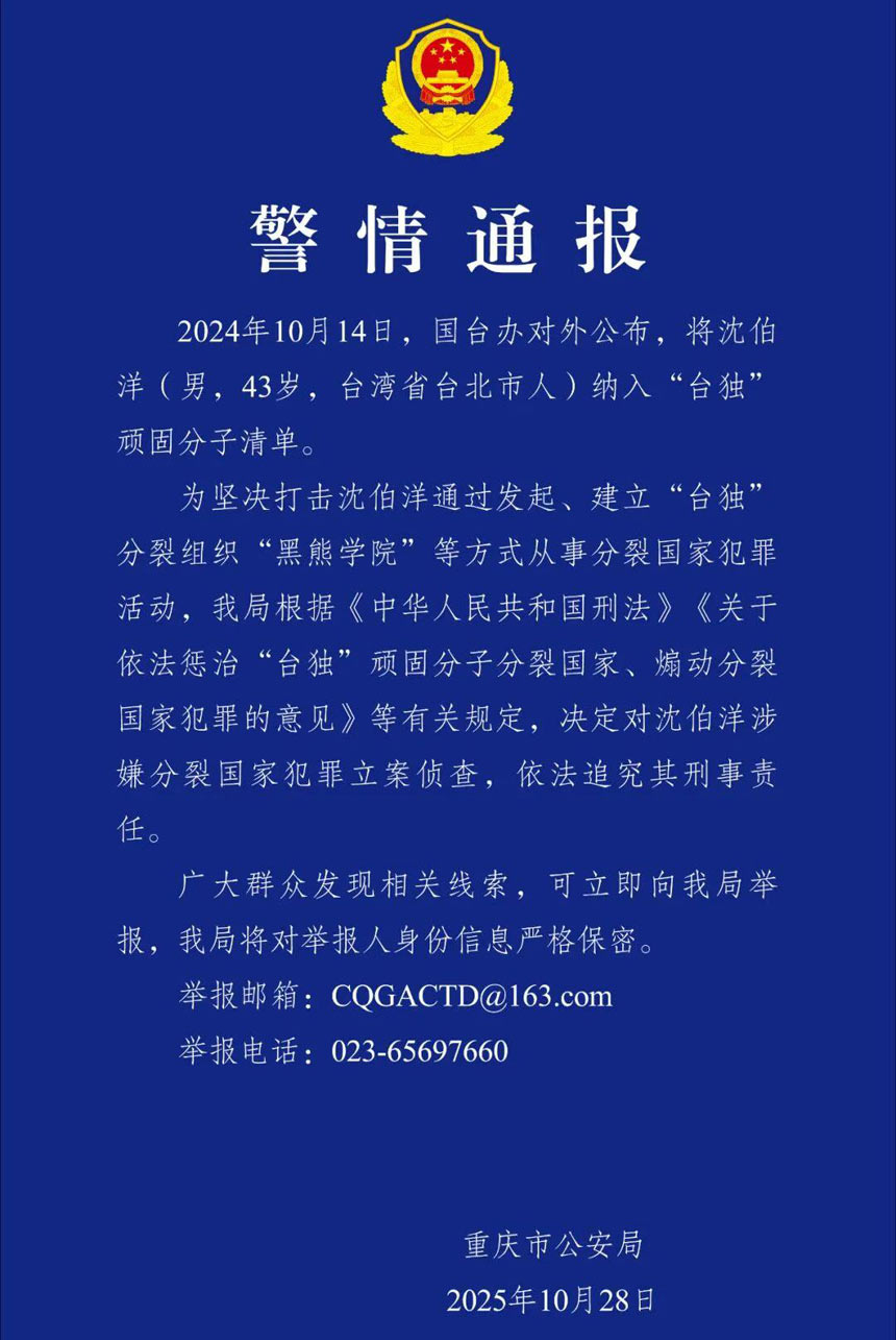 重慶市公安局28日發(fā)布警情通報表示,為堅決打擊沈伯洋通過發(fā)起、建立“臺獨”分裂組織“黑熊學院”等方式從事分裂國家犯罪活動,該局根據《中華人民共和國刑法》《關于依法懲治“臺獨”頑固分子分裂國家、煽動分裂國家犯罪的意見》等有關規(guī)定,決定對沈伯洋涉嫌分裂國家犯罪立案偵查,依法追究其刑事責任。