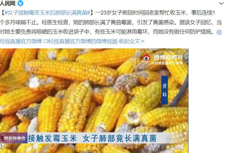 經(jīng)醫(yī)生檢查,她的肺部長(zhǎng)滿了黃曲霉菌,引發(fā)了真菌感染。據(jù)該女子回憶,當(dāng)時(shí)她主要負(fù)責(zé)將晾曬的玉米收進(jìn)袋子中,有些玉米可能淋雨霉壞,而她沒(méi)有做任何防護(hù)措施。