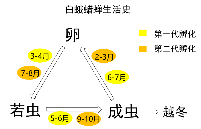 龍眼白蛾蠟蟬一般一年孵化兩代,第1代孵化盛期在3月下旬至4月中旬,若蟲盛發(fā)期在4月下旬至5月初,成蟲盛發(fā)期5-6月,第2代孵化盛期于7-8月,若蟲盛發(fā)期7月下旬至8月上旬,9-10月陸續(xù)出現(xiàn)成蟲,至11月所有若蟲幾乎發(fā)育為成蟲。