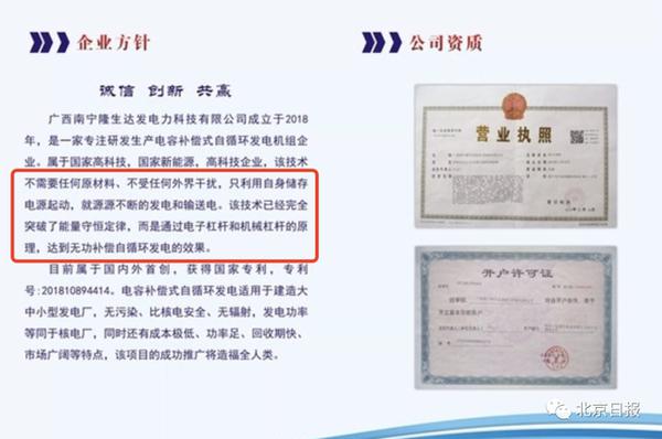 此前,廣西南寧隆生達(dá)發(fā)電力科技有限公司在官網(wǎng)聲稱,其擁有了一項技術(shù),不需要任何原材料,不受任何外界干擾,只需利用自身儲存電源啟動,就能源源不斷地發(fā)電和輸送電,且該技術(shù)已獲得了國家專利申請。其同時聲稱,通過該技術(shù)生產(chǎn)的發(fā)電機(jī)只需 1 度電便可發(fā) 10 度電,已經(jīng)突破了 " 能量守恒定律 "。該消息一經(jīng)發(fā)布后便在網(wǎng)絡(luò)上引起了巨大關(guān)注,而在面對外界普遍質(zhì)疑時,該公司依舊堅稱該技術(shù)并未存在夸大,是其公司首創(chuàng)的技術(shù)。