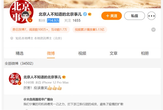 而且還有一些網(wǎng)絡(luò)名人,比如粉絲高達(dá)714.9萬的微博用戶@北京人不知道的北京事兒。
