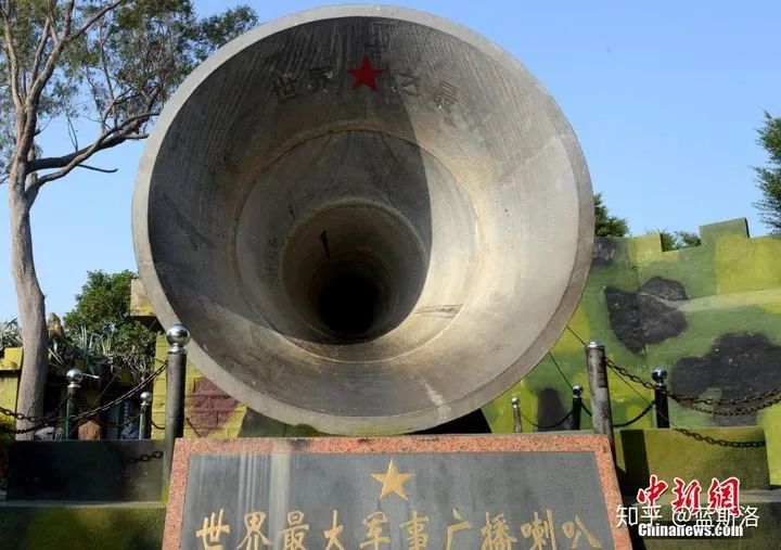 后來這還嫌不夠,又弄了個世界最大的軍事廣播喇叭,全身由鉛鋁鑄成,最大直徑2.88米,長近5米,重1588公斤。其發(fā)音最大功率為20000聲瓦,傳送聲音距離可達12公里,產(chǎn)生的聲波可以清晰地越過海面,直達金門島駐守軍人們的耳蝸。