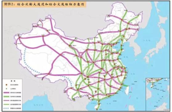 中共中央、國務(wù)院印發(fā)的《國家綜合立體交通網(wǎng)規(guī)劃綱要》,這份交通規(guī)劃包含6條主軸、7條走廊、8條通道,線網(wǎng)總規(guī)模將達到70萬公里左右。