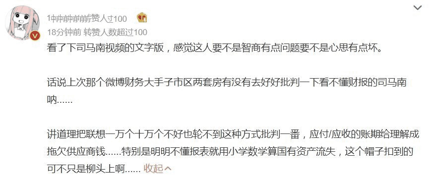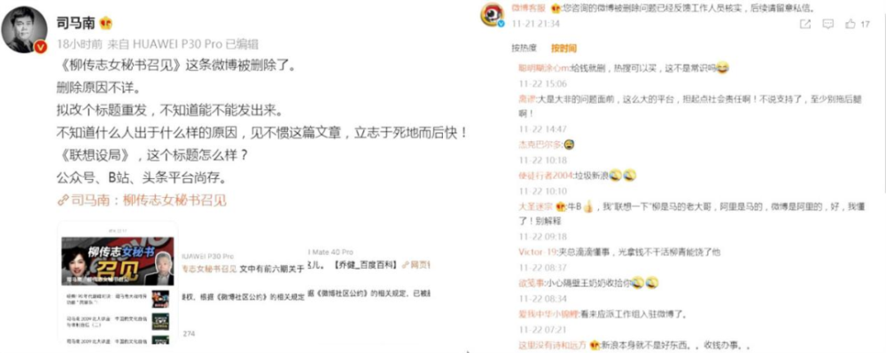 還有很多網(wǎng)友表示,不光是該條微博,司馬南的多個視頻都被刪除,搜索不到了,這也引發(fā)了我們的好奇心,按理來說,司馬南懟聯(lián)想,跟微博平臺沒有半毛錢關系,而且,司馬南也說了,那篇文章在公號和B站等平臺仍然存活,為何微博要“見不慣這篇文章,立志于死地而后快!”?