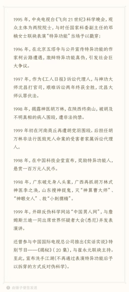1990年8月,司馬南在北京科學會堂召開“弘揚科學氣功,反對愚昧迷信”報告會上,扮演氣功大師,假戲真唱,在海內(nèi)外產(chǎn)生轟動,同年他還趁熱打鐵,出版了《氣功與騙術》專著并發(fā)行了《神功內(nèi)幕》影像碟片,隨后從北大開始,他揭穿各類神功騙術的全國巡回演講持續(xù)了十余年,還獲得了反偽特別貢獻獎。