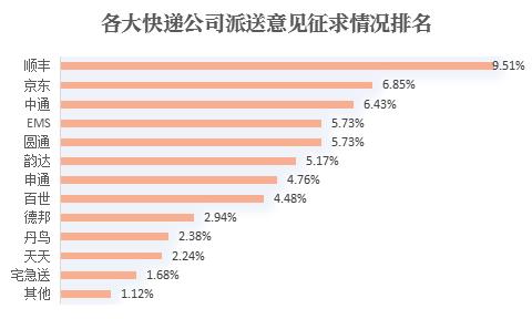 ○ 各大快遞公司派送意見征求情況排名前五位依次為:順豐、京東、中通、EMS、圓通。
