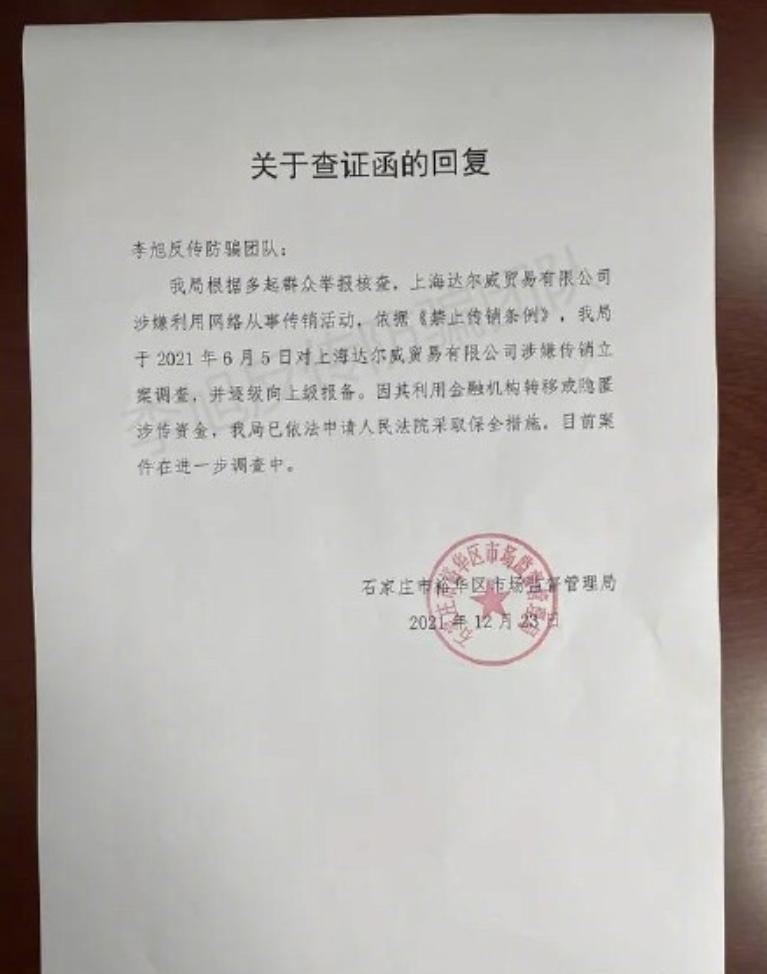 文中指出早在今年6月5日,上海市達爾威貿(mào)易有限公司就已經(jīng)因為涉嫌傳銷被立案調(diào)查,查證函的回復(fù)中還寫明因其利用金融機構(gòu)轉(zhuǎn)移或隱匿涉?zhèn)髻Y金,我局已申請采取保全措施,目前案件在進一步調(diào)查中,被財產(chǎn)保全凍結(jié)的資金高達6億元。
