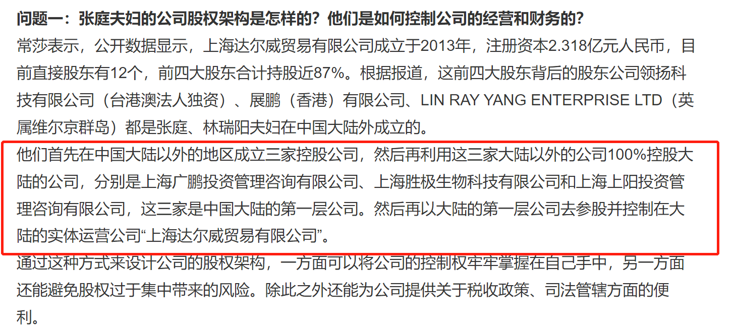 該律師表示,注冊資本2.318億元的上海達爾威貿(mào)易有限公司目前直接股東有12個,前四大股東合計持股近87%,這四大股東背后的股東公司領(lǐng)揚科技有限公司、展鵬(香港)有限公司、LIN RAY YANG ENTERPRISE LTD(英屬維爾京群島)都是張庭、林瑞陽夫婦在中國大陸外成立的。