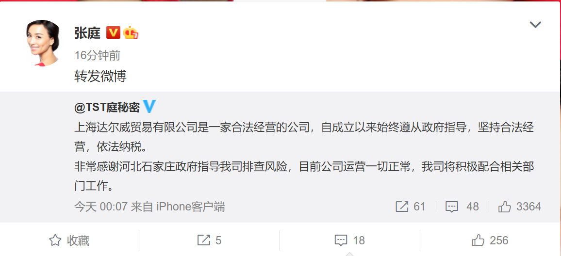 消息發(fā)布后,TST庭秘密聽過官方社交平臺回應(yīng)稱達爾威是合法經(jīng)營公司,依法納稅,目前只是排查風(fēng)險,公司運營一切正常。之后張庭和林瑞陽都轉(zhuǎn)發(fā)了這條內(nèi)容,但沒過多久,三個賬號就都被禁言了,由此可見,對張庭、林瑞陽以及達爾威的調(diào)查還在進行中,目前并沒有出最終結(jié)果。
