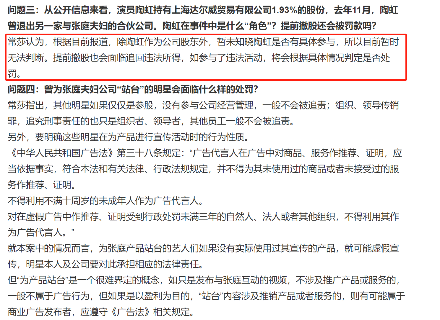 最后一個問題,演員陶虹持有達爾威公司1.93%的股份,此前還有包括林志玲在內(nèi)的多位明星曾為張庭夫婦公司“站臺”,他們會被處罰嗎?律師表示暫時還不清楚陶虹是否參與違法活動,如果只是持股會面臨追回違法所得,如果參與違法活動則會根據(jù)具體情況判斷是否處罰。至于其他明星,如果只是參股,沒有參與公司經(jīng)營管理一般也不會被追責(zé)。不過如果站臺藝人沒有實際使用過其宣傳的產(chǎn)品,就可能涉嫌虛假宣傳,明星本人及公司要對此承擔(dān)相應(yīng)的法律責(zé)任。
