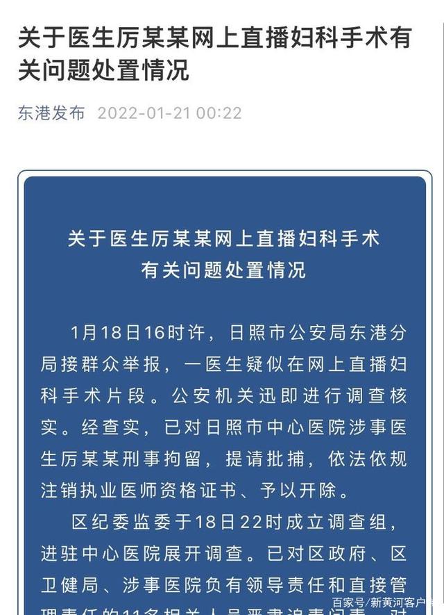 1月18日16時(shí)許,日照市公安局東港分局接群眾舉報(bào),一醫(yī)生疑似在網(wǎng)上直播婦科手術(shù)片段。公安機(jī)關(guān)迅即進(jìn)行調(diào)查核實(shí)。經(jīng)查實(shí),已對日照市中心醫(yī)院涉事醫(yī)生厲某某刑事拘留,提請批捕,依法依規(guī)注銷執(zhí)業(yè)醫(yī)師資格證書、予以開除。