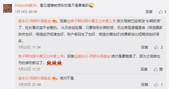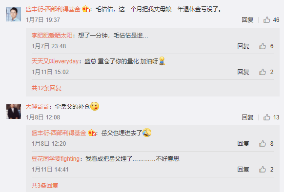1月上旬,在基金普遍下跌時,盛豐衍發(fā)微博稱,“這幾天跌得都不敢去丈母娘家蹭飯了~”。