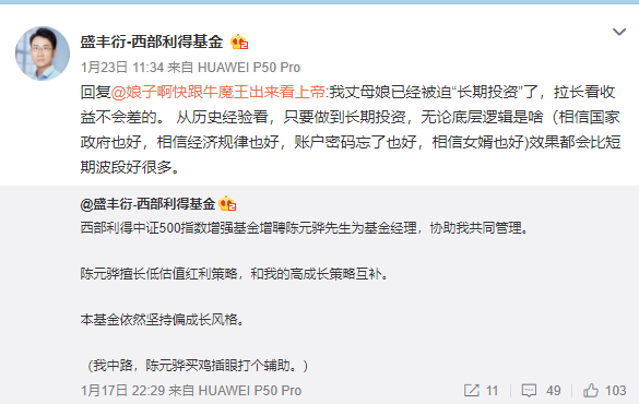 1月17日,他發(fā)微博介紹了西部利得中證500指數(shù)增強基金增聘基金經(jīng)理的情況。