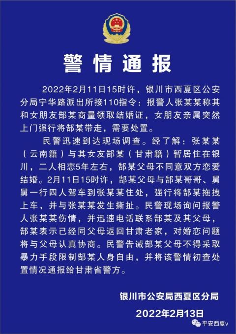 2月13日,銀川婦聯工作人員告訴北京青年報記者,他們已關注到此事并及時跟進,經了解,當事博主已聯系上女友,其女友不希望追究其家人責任,此事雙方正協(xié)商處理。