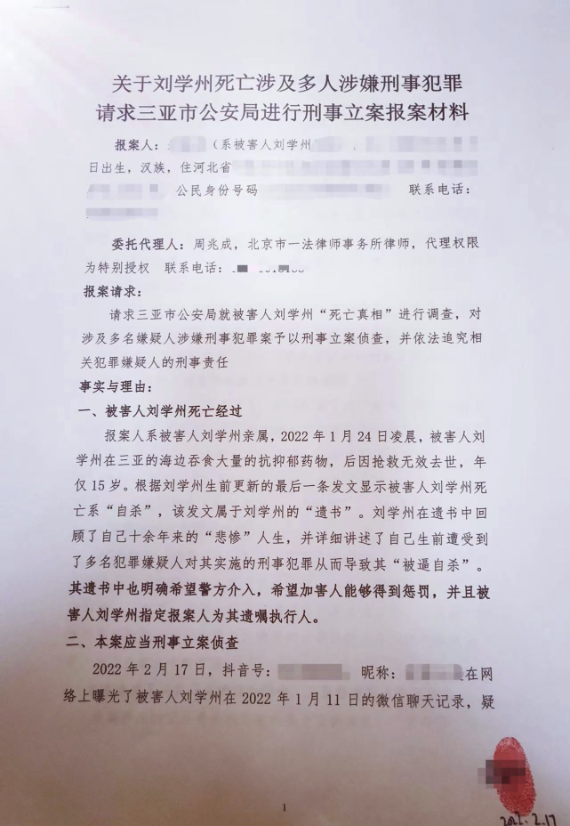 作為劉學(xué)州親屬代理律師,他可以證實(shí)劉學(xué)州親屬在2月17日向三亞市公安局提交了《報(bào)案材料》。要求三亞警方對劉學(xué)州死亡進(jìn)行全面調(diào)查,調(diào)取劉學(xué)州生前在三亞的活動軌跡以及接觸的社會關(guān)系和有關(guān)監(jiān)控視頻,全面調(diào)查清楚劉學(xué)州的死亡的真相,同時(shí)對他人涉嫌針對劉學(xué)州的多人多起刑事犯罪給予刑事立案追責(zé)。