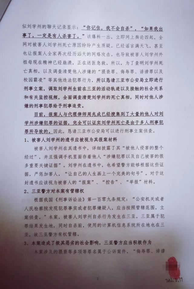 抖音上的截圖配文為“謎題還沒有解開”,并@了劉學(xué)州養(yǎng)家親屬的代理律師周兆成。對此,劉學(xué)州養(yǎng)家的舅媽柴女士表示,已經(jīng)看到了這一信息,確認(rèn)是劉學(xué)州生前與網(wǎng)友的聊天內(nèi)容。周兆成表示,為了查明劉學(xué)州死亡真相,以及調(diào)查清楚他人涉嫌的“猥褻罪、侮辱罪、誹謗罪以及校園霸凌”等多起違法犯罪行為,要求三亞警方刑事立案。