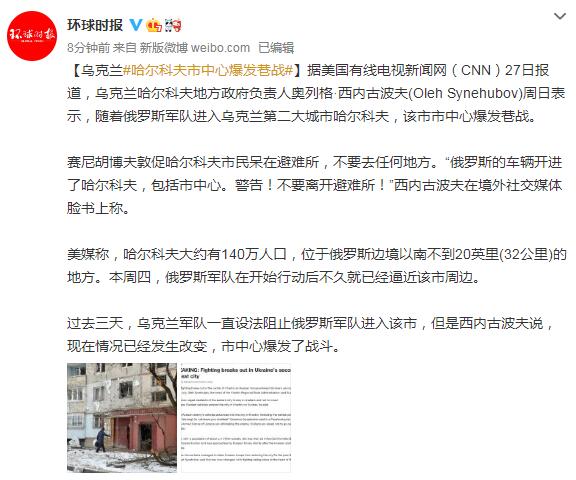 賽尼胡博夫敦促哈爾科夫市民呆在避難所,不要去任何地方!岸砹_斯的車(chē)輛開(kāi)進(jìn)了哈爾科夫,包括市中心。警告!不要離開(kāi)避難所!”西內(nèi)古波夫在境外社交媒體臉書(shū)上稱(chēng)。