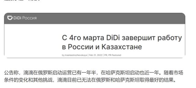 另外,滴滴官方也發(fā)布消息稱(chēng),滴滴打車(chē)將自今年3月4日起停止在俄羅斯等運(yùn)營(yíng),滴滴已通過(guò)電子郵件向司機(jī)、合伙人和乘客通報(bào)了這一消息。