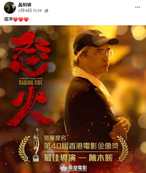 黃柏雄曾發(fā)文悼念已故的《怒火》導(dǎo)演陳木勝,恭喜他獲得金像獎(jiǎng)提名,未曾想不到一個(gè)月的時(shí)間,黃柏雄意外身亡。