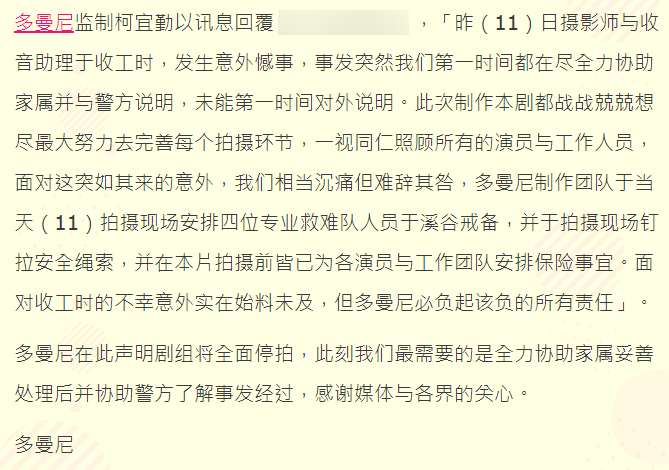 目前,制作方(多曼尼)聲明將全面停拍,全力協(xié)助家屬妥善處理后并協(xié)助警方了解事發(fā)經(jīng)過(guò)。