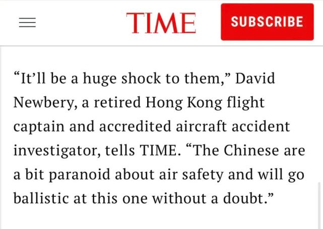 《時代》周刊網(wǎng)站3月21日發(fā)布了一篇題為《為什么東航客機墜毀事件對該國沖擊如此之大》的報道。其中名為大衛(wèi)·紐伯里的已在香港退休的機長、飛機事故調(diào)查員對該周刊說,“這對他們而言,會是個巨大的沖擊,”“中國人對航空安全有些偏執(zhí),毫無疑問,他們會對這次事件大發(fā)雷霆!
