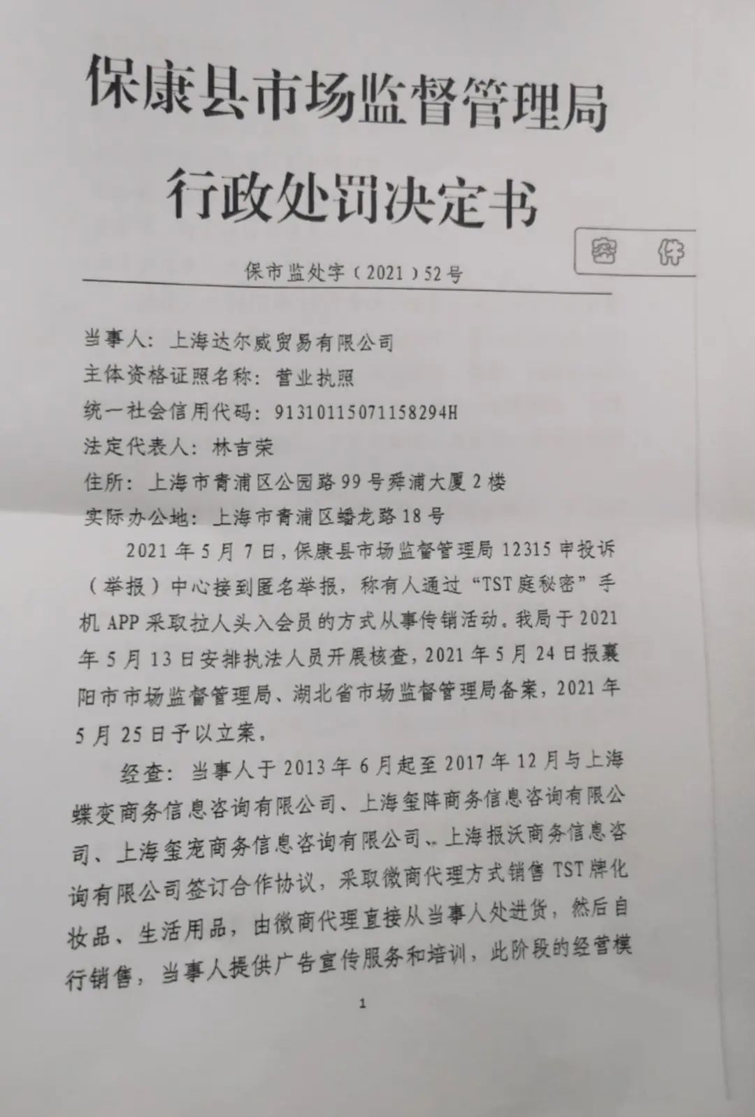 近日,一位TST庭秘密相關(guān)案件知情人士向雷達(dá)財(cái)經(jīng)提供的一份處罰決定書(shū)顯示,因涉及傳銷行為,TST庭秘密運(yùn)營(yíng)主體上海達(dá)爾威貿(mào)易有限公司被?悼h市場(chǎng)監(jiān)督管理局(下稱“保康縣市監(jiān)局”)處罰。