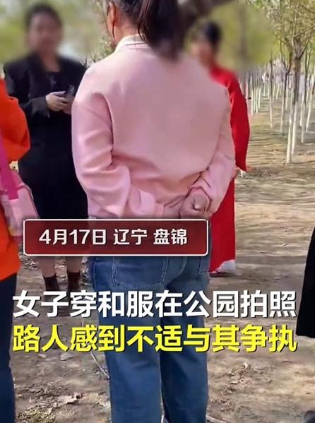 4月17日,在盤錦遼河濕地公園內(nèi),一女子穿著和服在樹下拍照,周圍的路人感到不適后上前規(guī)勸后,與其發(fā)生爭執(zhí)。