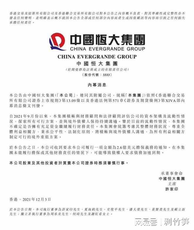 恒大集團的公告說得很委婉,事實上就是恒大有一筆2.6億美元的債務違約,恒大已經(jīng)無力支付債務,而且此信息一經(jīng)披露,可能會導致債權人加速催債,提醒購買恒大股票的投資者要謹慎行事。由于披露信息是上市公司必盡的義務,所以恒大不得不公告投資者。