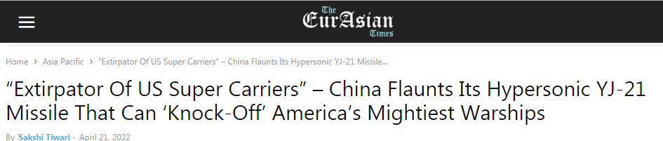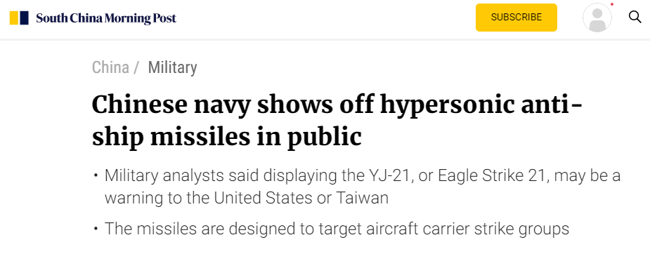 香港《南華早報》也注意到這條消息。該報道稱,中國海軍在臨近海軍節(jié)之前,展示了一種先進(jìn)的反艦導(dǎo)彈!斑@是‘鷹擊-21’高超音速導(dǎo)彈的首次對外展示,該導(dǎo)彈可以由艦艇或戰(zhàn)機(jī)攜帶。該導(dǎo)彈的射程在1000-1500 公里左右,據(jù)信能打擊航母打擊群!