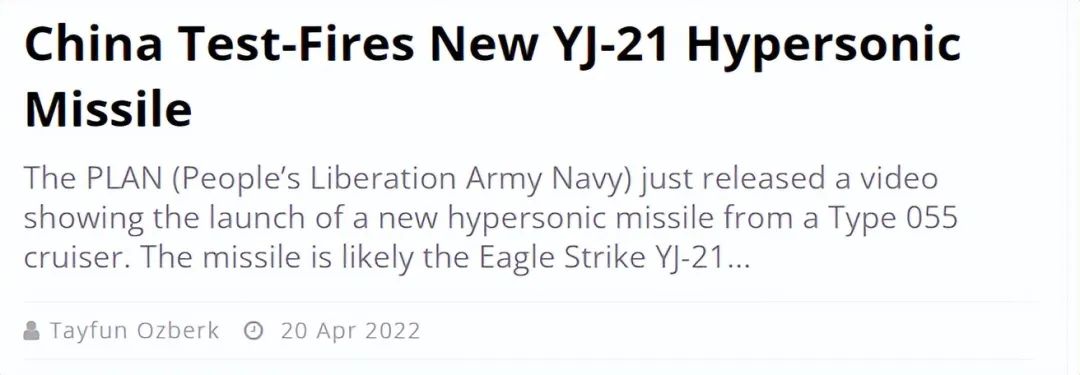 美國“海軍新聞”網(wǎng)站20日在“中國試射新型鷹擊-21高超音速導(dǎo)彈”的報道中提到,中國海軍近日發(fā)布了一段新型導(dǎo)彈從055型驅(qū)逐艦上升空的視頻。