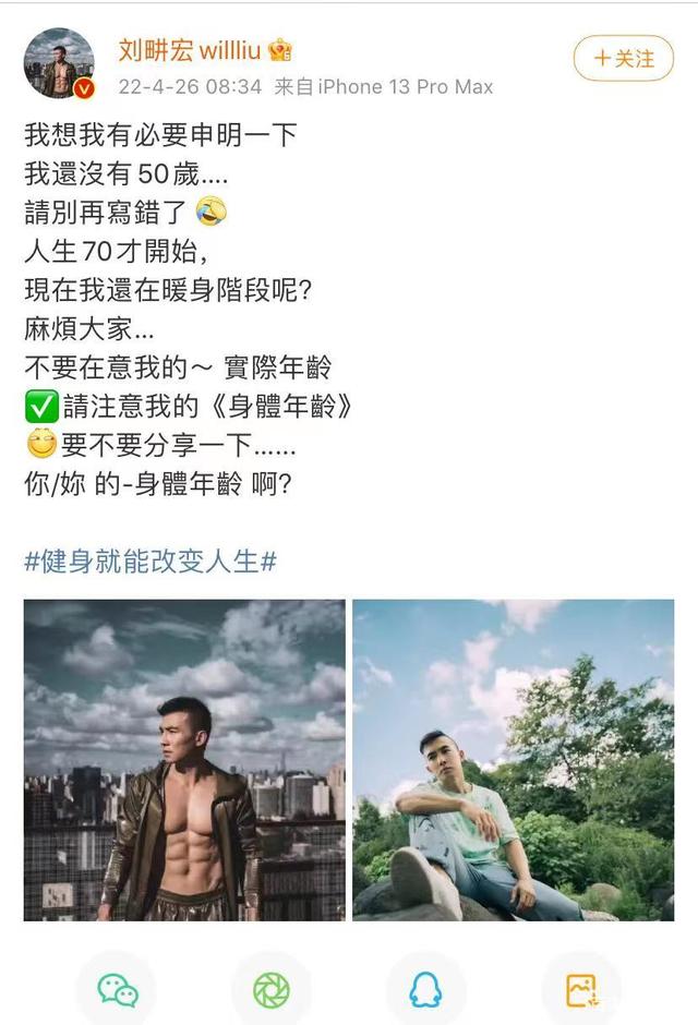 劉畊宏發(fā)文澄清自己沒有50歲,只是滿49歲,其實距離50歲還差幾個月,他的生日是10月7日。告訴大家不要寫錯,劉畊宏真的很實在,善意提醒大家,人生70才開始,現(xiàn)在還是在暖身階段,請大家不要在意自己的實際年齡,注意他的身體年齡。