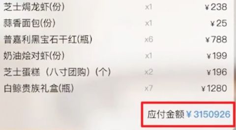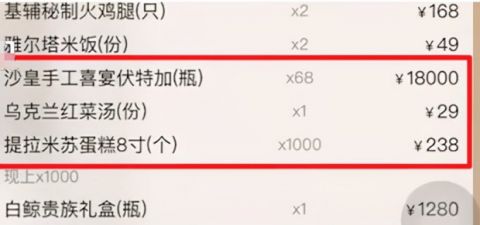 其中,238元的提拉米蘇蛋糕被下單1000份,單價18000元的沙皇手工喜宴伏特加也被點了68瓶。而且,這頓飯錢還一直在肉眼可見地漲。截至當天23:30分,點餐頁面顯示下單已超300萬元。