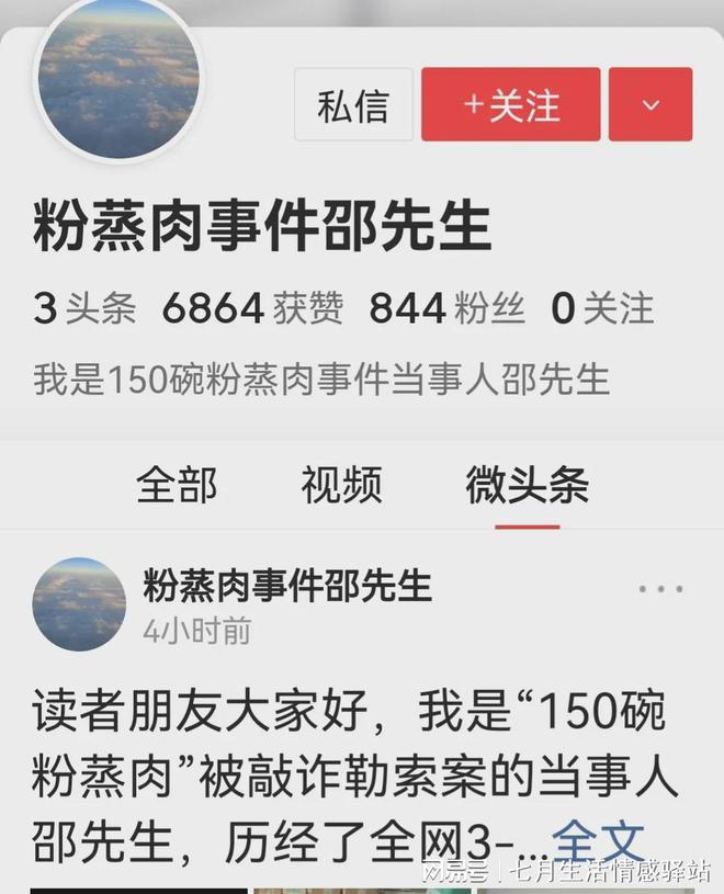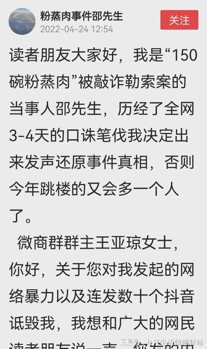 “粉蒸肉事件邵先生”今日頭條發(fā)文稱,我是“150碗粉蒸肉”被敲詐勒索案的當(dāng)事人邵先生,歷經(jīng)了全網(wǎng)3-4天的口誅筆伐我決定出來發(fā)聲還原事件真相,否則今年跳樓的又會(huì)多一個(gè)人了。