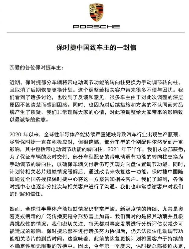 而且,保時捷在致歉信中對于這個減配的問題做出了這樣的解釋。大致意思就是從2020年開始,全球性半導體產(chǎn)能持續(xù)嚴重短缺,導致汽車行業(yè)出現(xiàn)了生產(chǎn)瓶頸,雖然保時捷一直在積極應對,但是部分車型的個別配件依然受到了嚴重的影響,而這其中就包括了帶電動調(diào)節(jié)功能的轉(zhuǎn)向柱。為了能夠保證車輛的及時交付所以部分車型所配備的。帶電動調(diào)節(jié)功能的轉(zhuǎn)向柱就變成了手動調(diào)節(jié)的轉(zhuǎn)向柱。雖然由電動變成了手動,但是對車輛方向盤位置的調(diào)節(jié)功能沒有任何的影響。