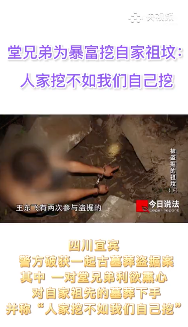 四川宜賓,警方破獲一起古墓盜掘案。其中,王東成和王東飛這對堂兄弟,竟參與挖掘自己祖先的墓葬。警方調查表明,王東成為了償還因賭博欠下的數萬元債務,先后參與盜掘了5座古墓葬,對自己家族祖先的墓葬下手,最初也是他先提議的。王東成稱:“給人家挖不如我們自己挖!